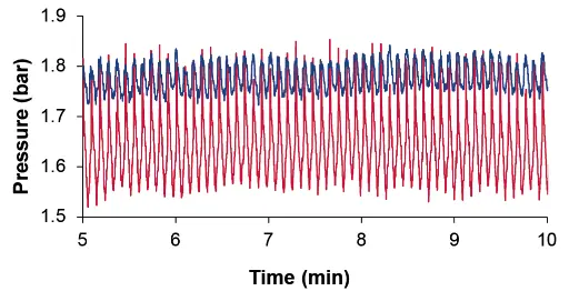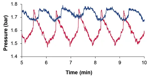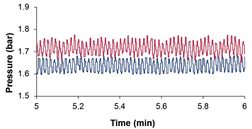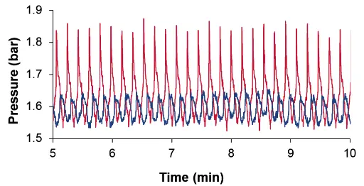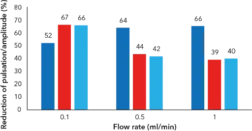 The pressure measurements were performed using an external pressure sensor. The pulse damper was installed behind the pump, followed by the external pressure sensor and a back pressure regulator. Testing was performed at various back pressures (w/o back pressure; approx. 1.5 bar; approx. 4.5 bar and approx. 10 bar). The following flow rates were tested: 0.05; 0.1; 0.5; 1 and 5 ml/min. The pressure signal of the external pressure sensor was recorded for 15 minutes. In addition, the flow was monitored with a flowmeter. The mean pressure was determined over a period of 10 minutes. The amplitude/pulsation was obtained from the difference of the max/min value over a period of 10 minutes. The relative reduction of the pulsation/amplitude was set in relation to the mean pressure value.