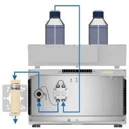 The biocompatible pulse damper was able to reduce pressure pulsation by up to 67 % at small flow rates. The best working conditions for the pulse damper were determined at flow rates below 1 ml/min in combination with a minimum back pressure of approximately 1.5 bar. At flow rates above 1 ml/min the pulse damper shows no benefit in reducing the pressure pulsation. The flow scheme and the capillary connection of the exemplary isocratic P 6.1L and the pulse damper are shown in Fig. 3. For most applications, the use of the pulse damper is not recommended when using the P 6.1L pump. Only when using very sensitive columns operating at low flow rates or performing analytical methods where baseline stability is important the pulse damper is beneficial. Care should be taken using gradient methods like ion exchange or hydrophobic interaction chromatography as the pulse damper increases the gradient delay or dwell volume of the system by 275 µl. Isocratic methods like size exclusion chromatography are not effected by the extra volume of the pulse damper.