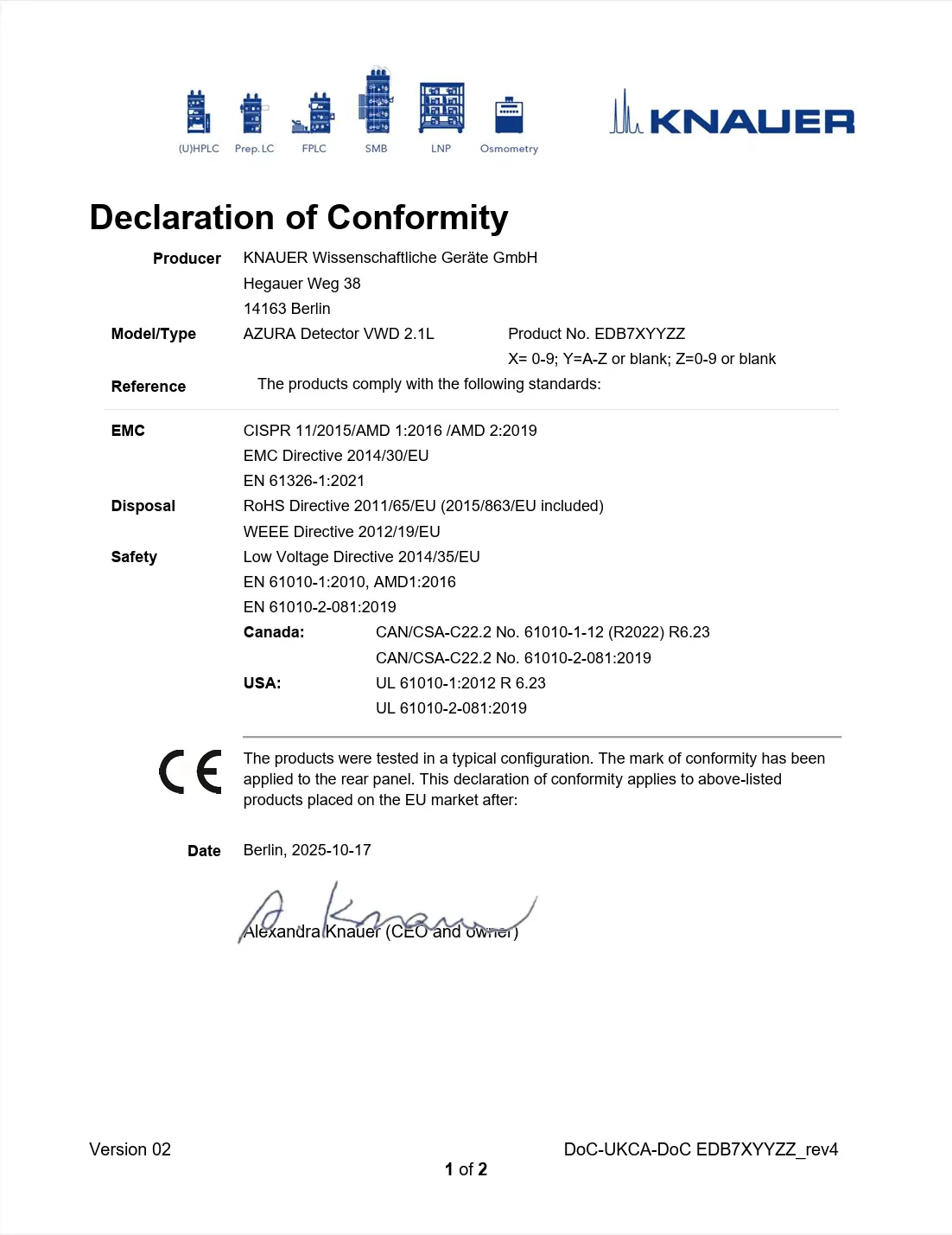 DoC – Detector AZURA DAD 6.1L, DAD 2.1L, MWD 2.1L