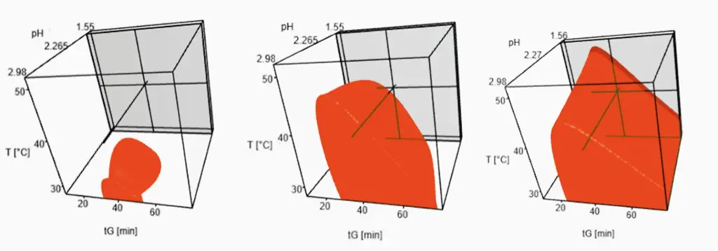 Fig. 1 Representation of the robust space using the tG-T-pH (30/90 min, 30/50°C, pH 1.6/2.2/2.8) with the columns C18 (left), C18H (center) and C18P (right), adjusted robust space level 1.6