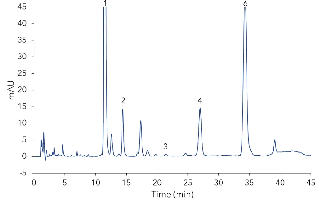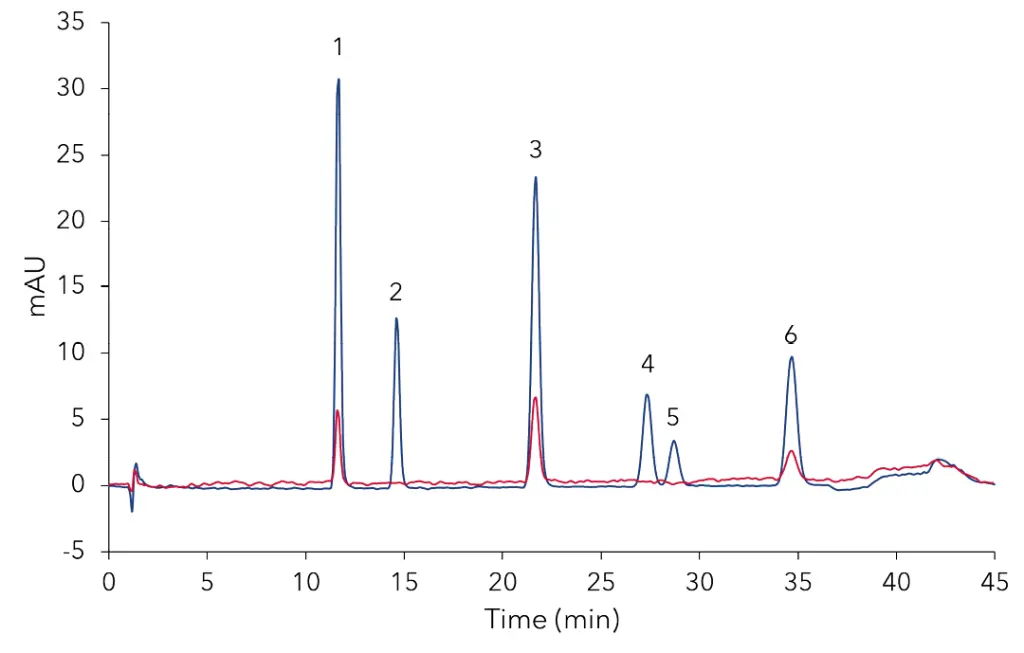 Fig. 2 Chromatogram of standard mix 10 µg/mL, R=1.5 between Δ8-THC and Δ9-THC; blue - 225 nm, red - 306 nm, 1 - CBDA, 2 - CBD, 3 - CBN, 4 - Δ9-THC, 5 - Δ8-THC, 6 - Δ9-THCA