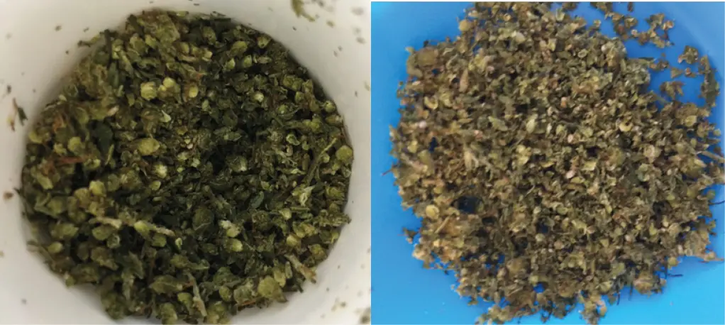 The whole 5 g portion of bediol was grinded with a flower grinder. The difference between grinded and original bediol is shown in Figure 5. The sample preparation was performed according to DAB, where 500 mg substance was extracted three times with 15 mL ethanol on a laboratory shaker for 15 min with a following centrifugation at 5000 rpm for one minute. Mixing all the extracts within 50 mL measuring flask, a 1:10 dilution was carried out and measured with the HPLC system after filtrating over a 0.45 µm RC filter.