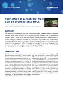 Cannabis sativa is used in agricultural and medical applications already for a long time. It contains a variety of compounds such as terpenoids, flavonoids and cannabinoids among which tetrahydrocannabinol (Δ9-THC) and cannabidiol (CBD) are the most abundant [1]. Δ9-THC is known for its psychoactive effects and is applied as medical treatment, but underlies strict legal regulations in most countries. CBD does not have the intoxicating effects of THC, and therefore the legislations are much more relaxed, yet. Depending on the field of application there are cannabis breeds with high THC content and others with low THC but high CBD content. As CBD shows medicinal effects as THC and is used i.e. for the treatment of neuropathic pain and chronic inflammatory conditions, the demand is growing. Many products such as CBD oil, drops and cosmetics are also available on the market [2,3,4,5]. The demand of highly pure CBD and other cannabinoids is increasing, and therefore different purification strategies are developed. Here, the purification of CBD from a CBD oil is described using a KNAUER AZURA® preparative HPLC system. An already described methanol–based gradient purification method was optimized for the purification of solely CBD7. Further, the whole process from sample analysis over method development in analytical scale, the scale-up to preparative scale and finally the purification of CBD is shown. Due to strict regulatory conditions concerning the novel food legislation in 2019 , it was difficult to acquire a CBD rich paste or other CBD process sample. For this reason, a commercial CBD rich oil was used as sample.