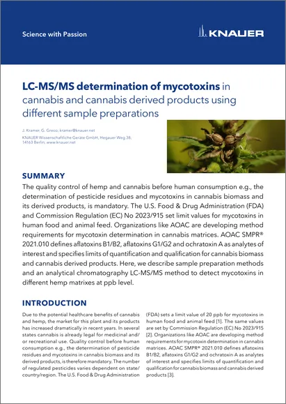 Due to the potential healthcare benefits of cannabis and hemp, the market for this plant and its products has increased dramatically in recent years. In several states cannabis is already legal for medicinal and/or recreational use. Quality control before human consumption e.g., the determination of pesticide residues and mycotoxins in cannabis biomass and its derived products, is therefore mandatory. The number of regulated pesticides varies dependent on state/country/region. The U.S. Food & Drug Administration (FDA) sets a limit value of 20 ppb for mycotoxins in human food and animal feed [1]. The same values are set by Commission Regulation (EC) No 2023/915 [2]. Organizations like AOAC are developing method requirements for mycotoxin determination in cannabis matrices. AOAC SMPR® 2021.010 defines aflatoxins B1/B2, aflatoxins G1/G2 and ochratoxin A as analytes of interest and specifies limits of quantification and qualification for cannabis biomass and cannabis derived products [3].