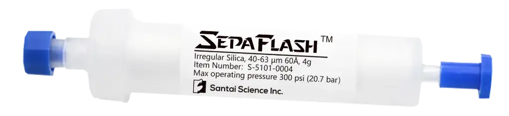 A Santai SepaFlash pre-packed flash column (4 g size). These disposable polypropylene cartridges are filled with high-purity silica and feature Luer-lock connectors for easy setup. They are compatible with common flash chromatography systems and designed for single or few-use purification runs.